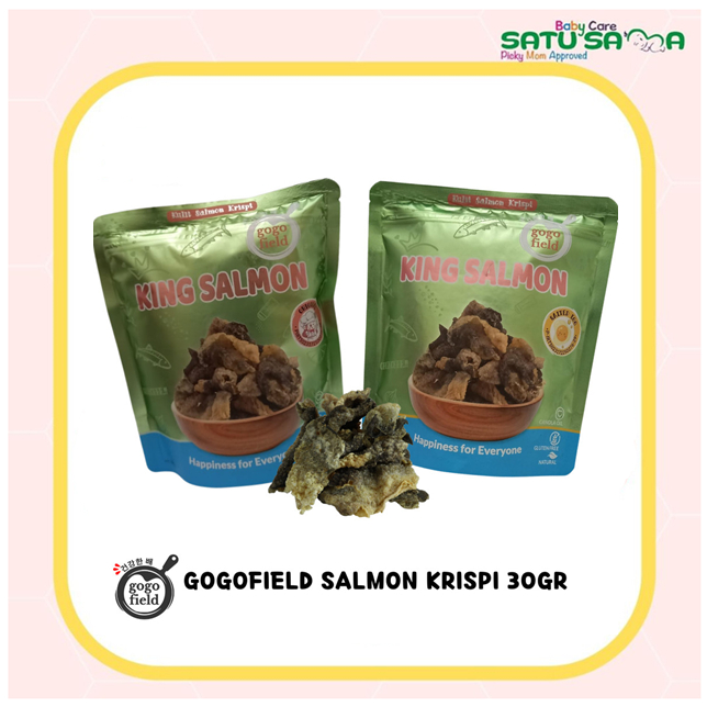 Gogofield King Salmon menggunakan kulit ikan salmon piliphan yang dibersihkan, dibumbui dan di goreng dengan minyak premium "kanola" sampai mekar dan krispi.