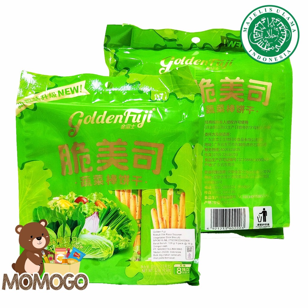 Biskuit stik rasa sayuran yang diproduksi oleh Golden fuji. biskuit ini memiliki rasa gurih dan sehat, serta terbuat dari bahan-bahan sayuran segar. Biskuit ini sudah halal dan terdaftar di BPOM RI.