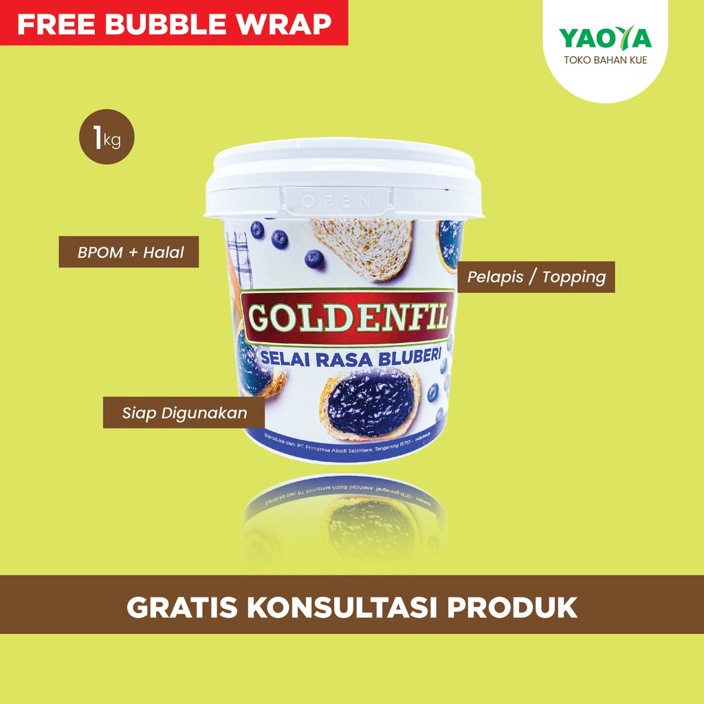 Selai Goldenfil blueberry Jam mengandung 50% buah asli. Rasanya sangat segar dan natural buah, ada serat buah yg dilumatkan. Cocok untuk digunakan sebagai isian roti, kue kering, campuran minuman yoghurt, smoothies.