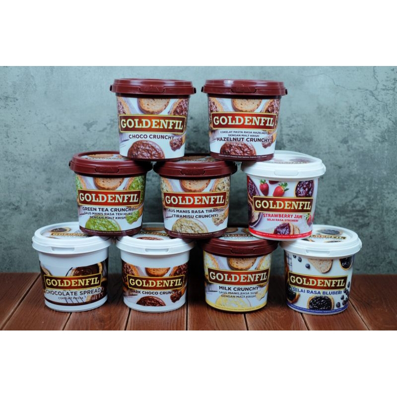 GOLDENFIL CRUNCHY TERSEDIA DENGAN BEBERAPA RASA. COKLAT. TIRAMISU. GREENTEA. STRAWBERY. BLUBERRY. MILK. KEJU. SPREED
