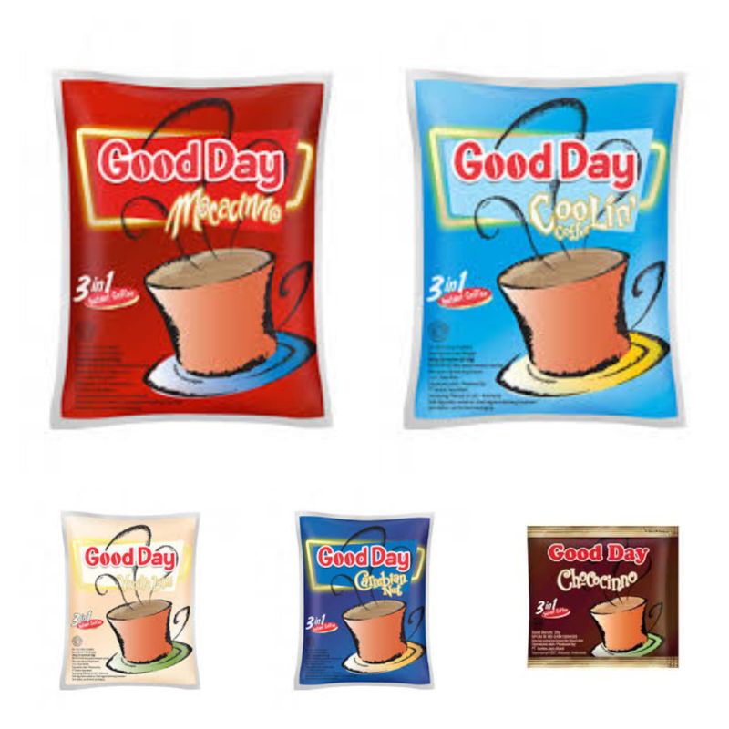Good Day minuman serbuk dengan aneka rasa yang dapat anda nikmati. Harga tertera di atas harga 1 renceng isi 10 sachet.