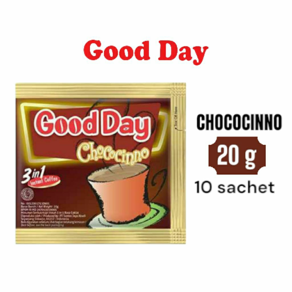 Good Day Chococinno Kopi Instant 3 in 1 lengkap dengan perpaduan rasa coklat yang nikmat.