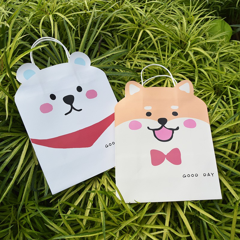 Kantong kertas dekoratif bertema karakter beruang putih yang lucu dan shiba inu yang menggemaskan. Dengan ukuran yang lumayan besar, cocok untuk menyimpan apa saja. Gunakan untuk memberikan bingkisan/kado atau sekedar pengganti kantong biasa. Bahan kantong terbuat dari kertas karton tebal dan dilengkapi tali kertas yang tidak mudah koyak.