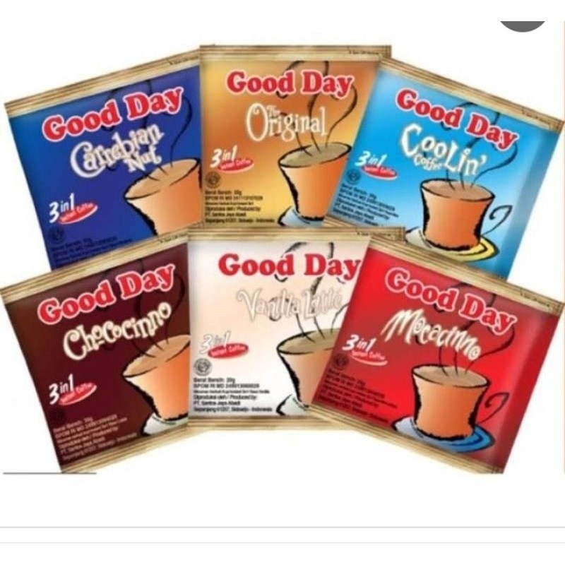 Good Day 3in1 tersedia berbagai varian rasa Mochachino, chocochino, vanilla latte,original, coolin, carebian