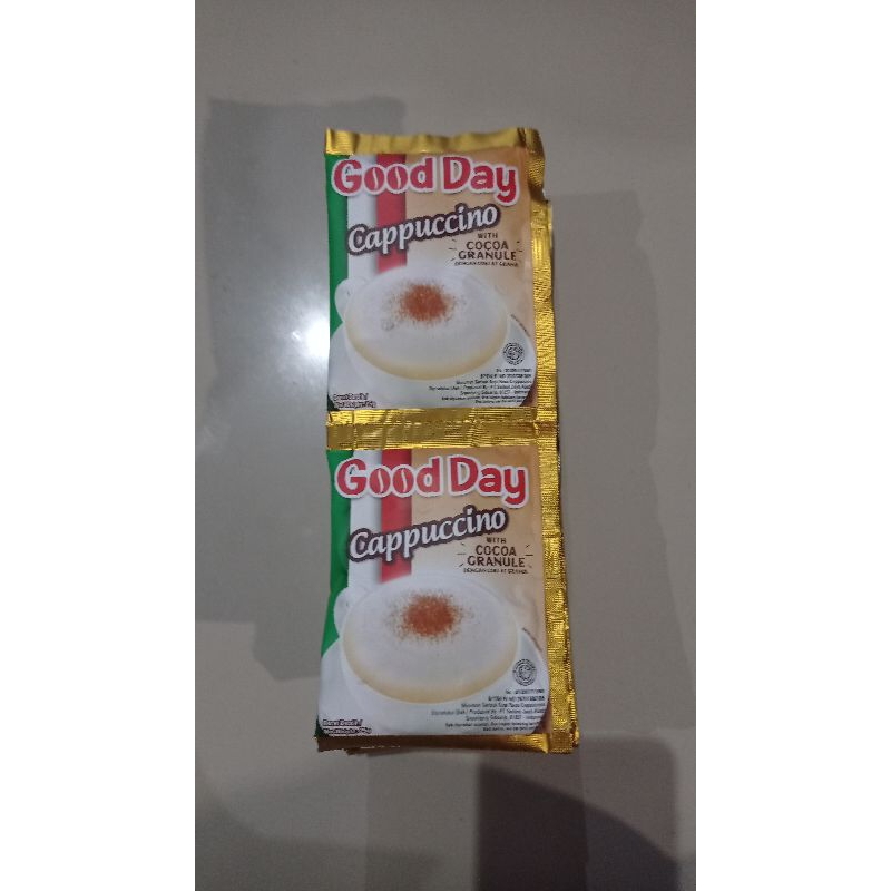 Good Day Cappuccino 10 x 25gr adalah minuman kopi instan dengan kopi, gula, dan krimer dalam satu sachet. Sachet kopi Good Day instan dalam satu renceng untuk hari-harimu yang penuh warna. Rasa cappuccino yang istimewa dalam setiap gelasnya menjadikan kopi Good Day ini sangat pas dinikmati dalam setiap momen hangatmu bersama teman atau orang kesayangan. Selain itu, taburan coklat granule yang sangat istimewa menjadikannya berbeda dengan kopi cappuccino lainnya. Rasakan kenikmatan yang lebih maksimal dari Good Day Cappuccino dengan meminumnya ketika dingin atau panas. Rasakan nikmatnya kopi cappuccino yang istimewa dalam harimu yang penuh ide bersama Good Day Cappuccino 10 x 25gr.