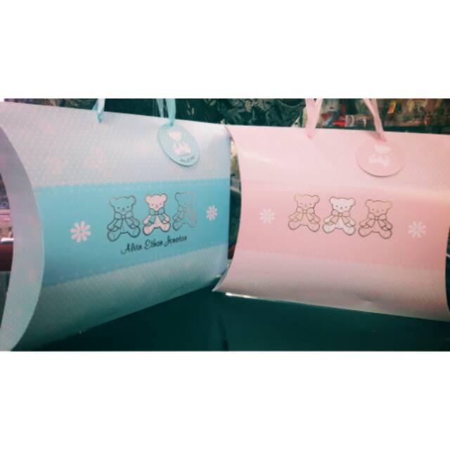 Goodie bag bisa ditenteng dengan Design menarik bergambar bear list metalic silver dan gold.