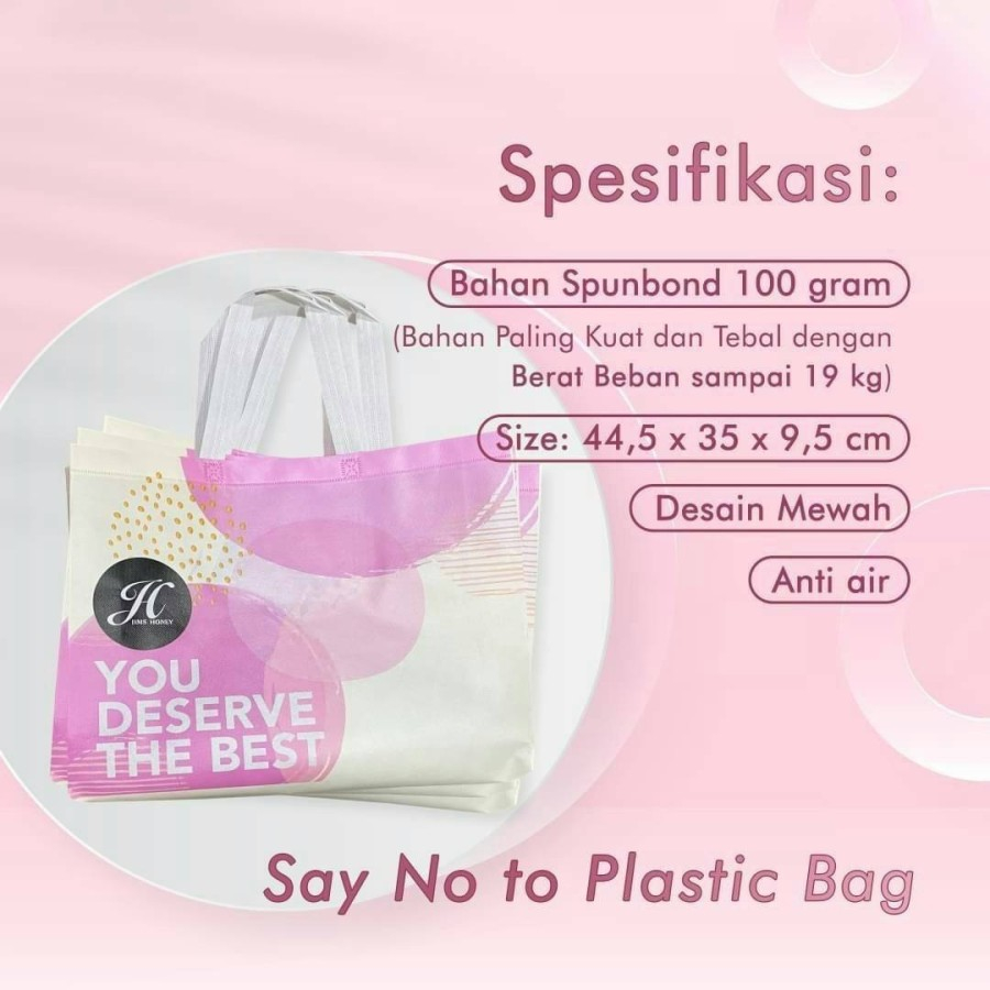 Dengan desain mewah menggunakan bahan spunbond 100 gram, dimana merupakan bahan spunbond paling kuat dan tebal. Bisa menampung isi sampai dengan 19 kg / setara 1 galon air. Bisa digunakan berulang - ulang dan anti air. Pembuatan Goodie Bag menggunakan teknik jahitan yg rapi dan sangat kuat. Memiliki ukuran 44,5 x 35x 9,5 cm.