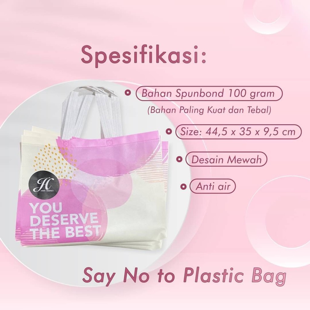 Dengan desain mewah menggunakan bahan spunbond 100 gram, dimana merupakan bahan spunbond paling kuat dan tebal. Bisa menampung isi sampai dengan 19 kg / setara 1 galon air. Bisa digunakan berulang - ulang dan anti air