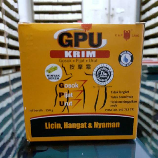 GPU Krim adalah krim pertama yang bisa untuk gosok bahkan pijat. Hadir dengan formula khusus yang tidak lengket, tidak berminyak dan tidak meninggalkan noda. Dengan tingkat kelicinan yang pas serta mudah diserap oleh kulit, GPU Krim sangat cocok bagi mereka yang menginginkan sensasi pijat GPU yang berbeda. Dengan 3 pilihan aroma khas yaitu minyak jahe, minyak sereh dan minyak pala, GPU Krim berkhasiat untuk membantu meredakan pegal linu, nyeri sendi, sakit pinggang, keseleo, memar dan memperlancar peredaran darah.