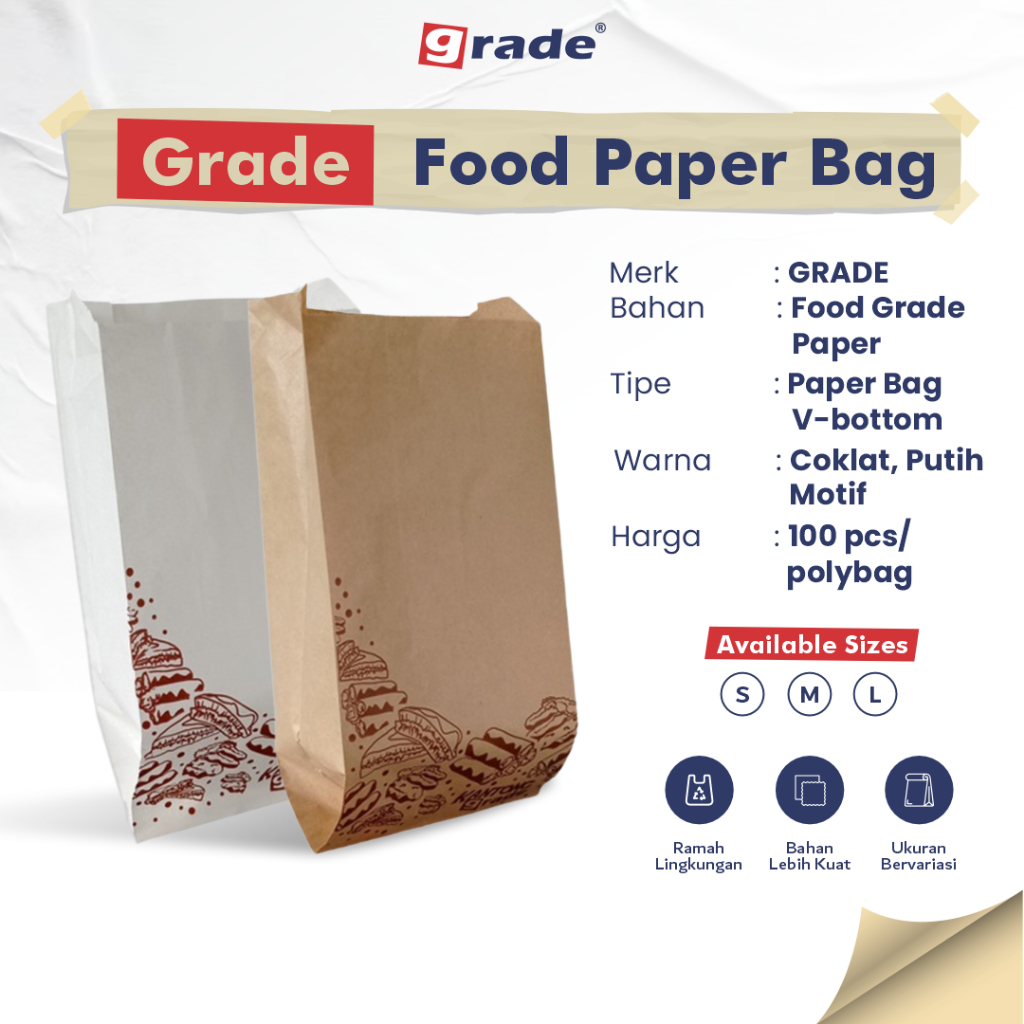 Paper Bag GRADE V Bottom Food Grade dibuat sedemikian rupa untuk mampu menampung makanan seperti kue-kue basah, kue kering hingga gorengan. Ukuran ini telah diteliti dan dinilai lebih efisien untuk menggantikan kantong plastik sekali pakai pada market Indonesia.