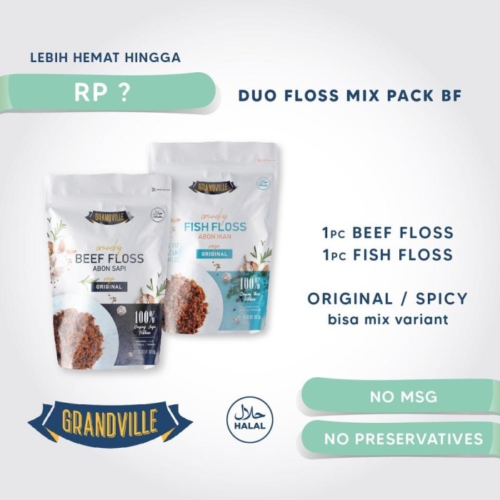 Grandville Abon SAPI amp; IKAN Crunchy Duo Mix Pack Ukuran : 2 X 100Gr Exp Date : 1 Tahun/12 Bulan No. PIRT : 5013578015452-23 *HALAL *MENGGUNAKAN 100% DAGING SAPI amp; IKAN ASLI KUALITAS TERBAIK *TANPA MENGGUNAKAN MSG *TANPA MENGGUNAKAN PENGAWET Grandville Abon adalah abon SAPI amp; IKAN pertama di Indonesia dengan tekstur yang Crunchy, dibuat dari daging SAPI amp; IKAN asli dengan bumbu rempah berkualitas terbaik tanpa menggunakan MSG dan pengawet sehingga cocok untuk menjadi makanan pendamping si Kecil (MPASI). Grandville abon SAPI amp; IKAN hadir dengan 2 variant rasa yaitu original (tidak pedas) dan spicy (tingkat kepedasan medium). Grandville abon SAPI amp; IKAN bertekstur renyah dengan perpaduan rasa gurih, manis dan asin yang pas sehingga berbeda dari abon SAPI amp; IKAN lainnya, membuat Grandville abon SAPI amp; IKAN selalu menjadi makanan favorit pendamping si kecil (MPASI), jadi Moms ga perlu repot lagi bila anak susah makan karena Grandville senantiasa menjadi solusi. Nutrisi yang terdapat pada abon SAPI dan IKAN : Grandville abon SAPI dan IKAN Sangat Cocok untuk dikonsumsi segala usia mulai dari siKecil usia 7 bulan MPASI, Grandville abon gluten dan dairy free ya momvilles jadi yang ada alergi dairy atau gluten ga perlu khawatir. Grandville abon SAPI dan IKAN juga cocok dijadikan makanan tambahan/pemanis untuk menu-menu dibawah ini : - Nasi Rames - Nasi Kuning - Nasi Campur - Roti Abon - Roti Bakar - Bakpao isi abon - Bubur ayam/sapi Dll Nie Momvilles Petunjuk penggunaan amp; Cara Penyimpanan produk Grandville Abon: sih kata Momville Tentang Grandvile Floss ??