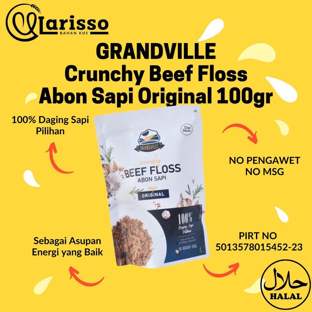 Grandville Crunchy Beef Floss yaitu Abon yang terbuat dari 100% daging sapi asli pilihan dari bagian kualitas terbaik. Abon tampak seperti serat-serat kapas, karena didominasi oleh serat-serat otot mengering yang disuwir-suwir. Karena kering dan nyaris tak memiliki sisa kadar air, abon biasanya awet disimpan berminggu-minggu dalam kemasan yang kedap udara. Warna abonnya yang cantik berasal dari perpaduan bumbu rempah alami tanpa pengawet dan yang pastinya NO MSG. Dengan ciri khas rasanya yang cenderung manis tapi gurih, menjadikan abon salah satu jenis makanan yang disukai hampir semua orang.