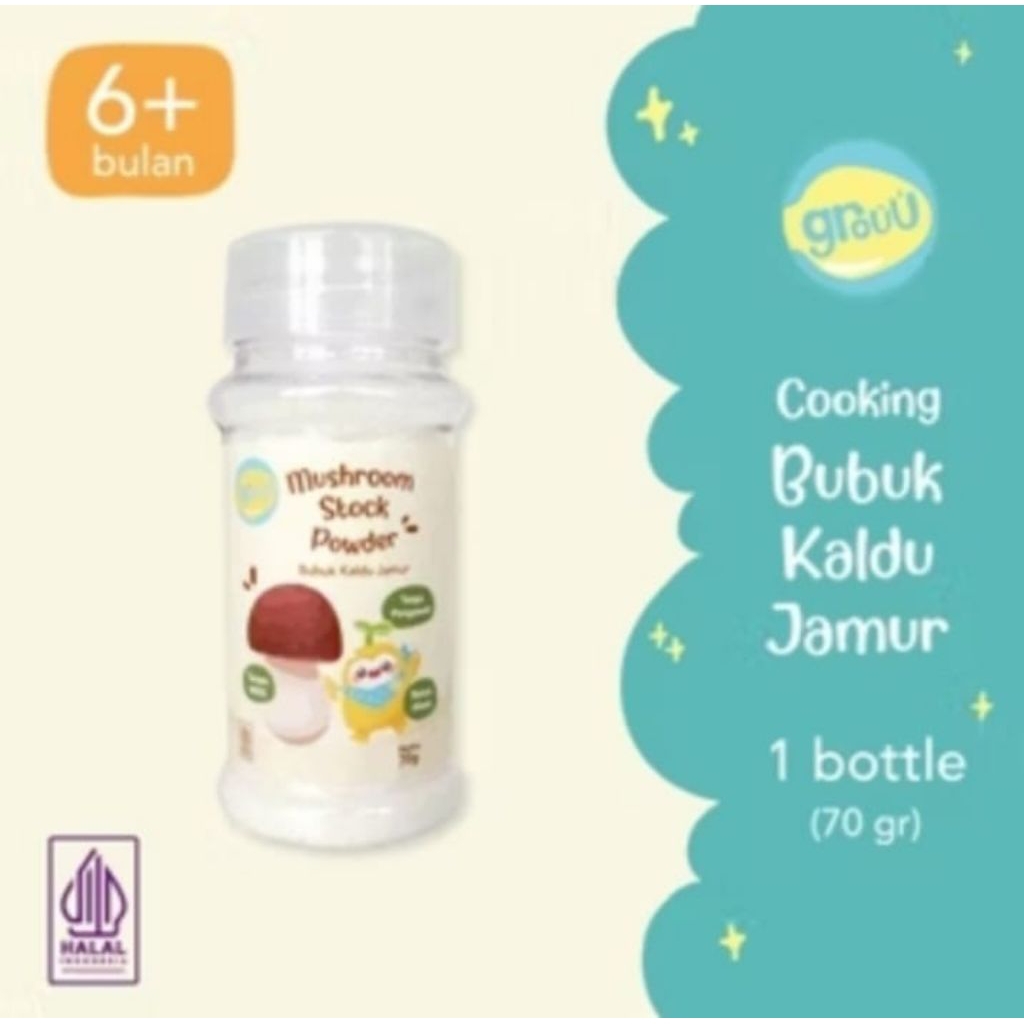 Grouu Mushroom adalah bubuk kaldu jamur yang terbuat dari rempah-rempah alami dan jamur pilihan. Bubuk ini dirancang untuk memberikan aroma dan rasa pada berbagai masakan. Grouu Mushroom juga tersedia dalam bentuk bubuk kaldu jamur, yang bisa digunakan sebagai bumbu dasar untuk berbagai hidangan. Selain itu, Grouu juga menawarkan produk MPASI (Makanan Pendamping ASI) untuk bayi, yang terbuat dari bahan-bahan alami seperti daging sapi, kacang-kacangan, bawang, dan rempah-rempah.