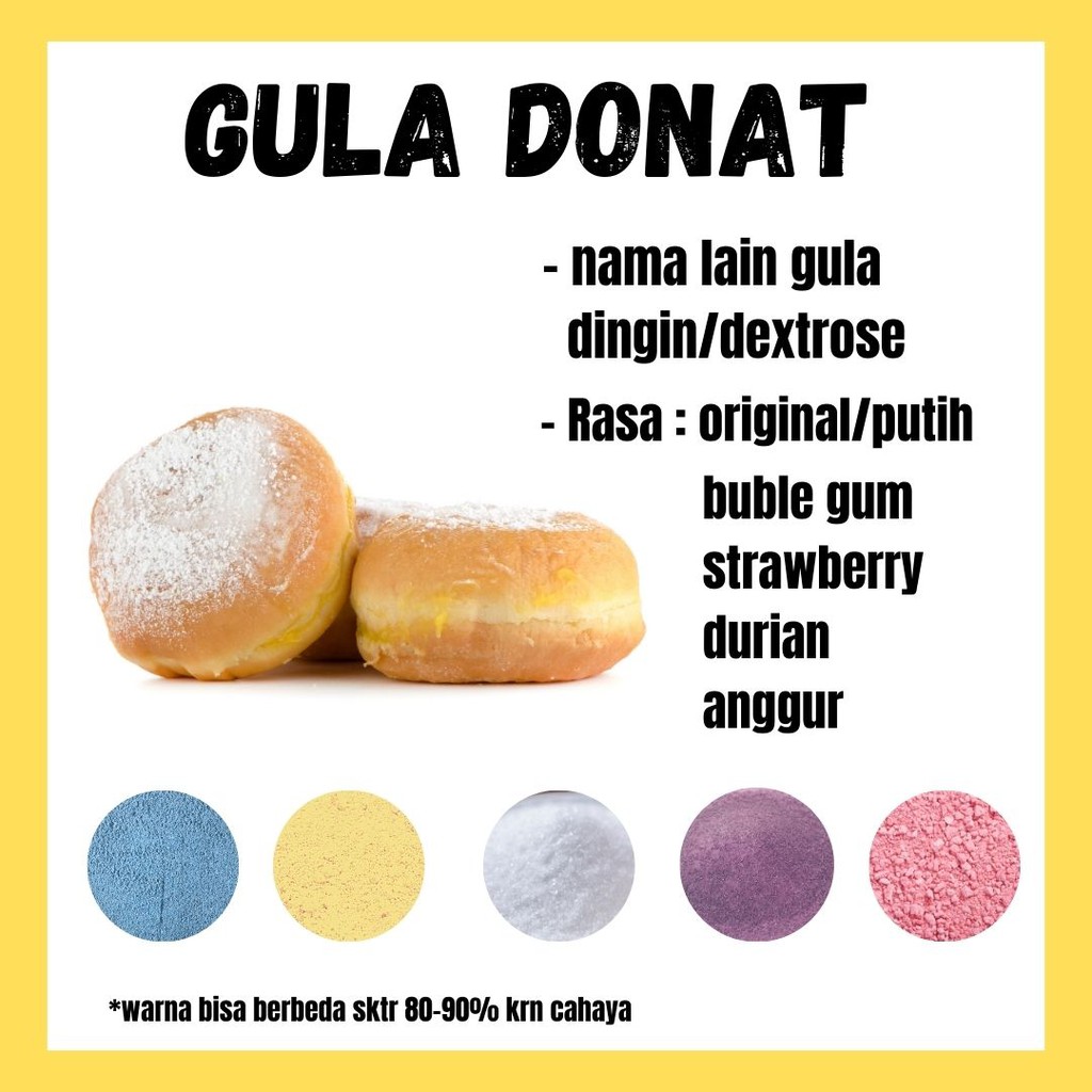 Sesuai namanya gula donat ini memang untuk taburan donat. Perbedaan utamanya dengan gula bubuk biasa adalah gula donat sudah ditambahi dengan rasa mint yang memberikan sensasi dingin-dingin sedap saat mengunyah donat.