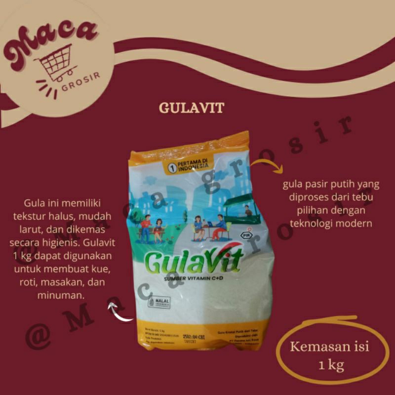 Gulavit 1 kg adalah gula pasir putih kristal yang mengandung vitamin A, C, dan D. Gula ini diproses dari tebu pilihan dengan teknologi modern dan bebas bahan tambahan.