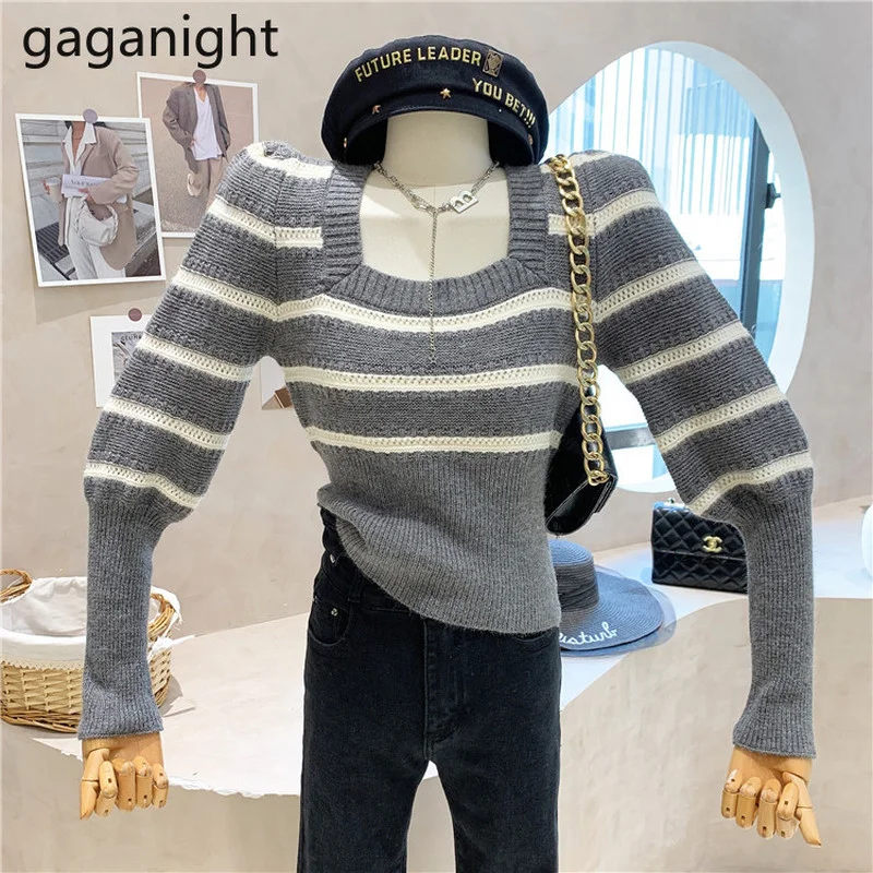 Gaganight женский свитер 2021 осень и зима новая Корейская версия дикий тонкий квадратный воротник свободный короткий полосатый Женский трикотаж...