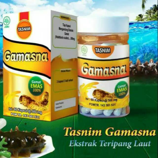 Tasnim Gamasna adalah terbuat dari gamat emas pilihan yang memiliki khasiat/reaksi lebih cepat dan hasil yang optimal. Dan dapat membantu meningkatkan fungsi regenerasi sel, membantu pengobatan pada penyakit jantung koroner, asam urat, diabetes mellitus, kolesterol, gula darah, hepatitis, hipertensi, lupus, maag (lambung), jerawat, luka-luka, luka bakar, radang paru-paru, tipus, tumor, stroke, epilepsi, asma, osteoporosis, ostoearthritis, menyembuhkan patah tulang, dll.