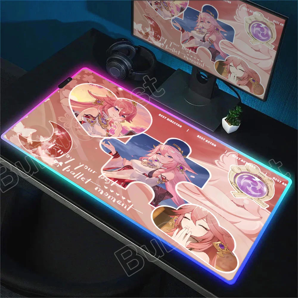 Gamer Genshin Yae Miko Raiden Shogun Mouse Pad Anime Gaming Mouse Pad LED Table Pads Backlit Desktop XXL Mousepad RGB Desk Mats