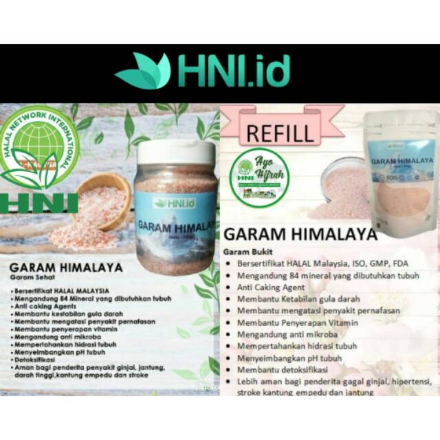 Garam himalaya, 100% asli garam himalaya, bukan oplosan dari garam dapur biasa yang di warnai pink Garam Himalaya Premium memiliki tekstur khusus, bukan hanya warna pink polos, tapi ada warna bercak merah nya juga yang menandakan bahwa garam himalaya ini asli dari penambangan garam Khewra Salt Mine di Pakistan, ditambang secara manual dengan tangan, dari batuan yang terbentuk jutaan tahun lalu, sehingga bebas dari zat polutan Garam Himalaya Premium mengandung 84 mineral, terutama zat besi, sehingga warna garam Himalaya Chiajoy sangat khas Garam himalaya dipercayai : 1. Kaya akan elektrolit dan bisa sebagai anti dehidrasi atau diare 2. Melawan infeksi 3. Natrium klorida yang tinggi sehingga baik untuk hipertensi dibandingkan garam biasa 4. Memperkuat daya tahan tubuh karena tinggi natrium 5. Mengandung 4 kali kalsium dibandingkan garam dapur biasa 6. Mengandung 3 kali potasium dan zat besi dibanding garam dapur biasa Setiap pack Garam Himalaya Chiajoy akan dikemas dalam standing pouch berbahan campuran nylon, LDPE dan PE, dengan tebal 140 micron dan food grade. Kategori garam Himalayan Chiajoy = fine grade, jadi halus seperti garam dapur, tapi tidak sehalus tepung..