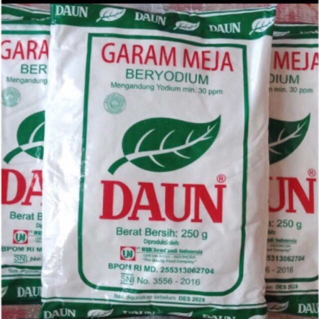 Garam Halus beryodium cap DAUN (mengandung min. 30ppm) bermutu tinggi yang bermanfaat untuk pertumbuhan dan kecerdasan anak, serta pencegahan penyakit gondok. bersih, putih dan Gurih karena diproses menggunakan mesin modern dengan standar internasional. merupakan pilihan tepat untuk keluarga sehat dan untuk melezatkan masakan.