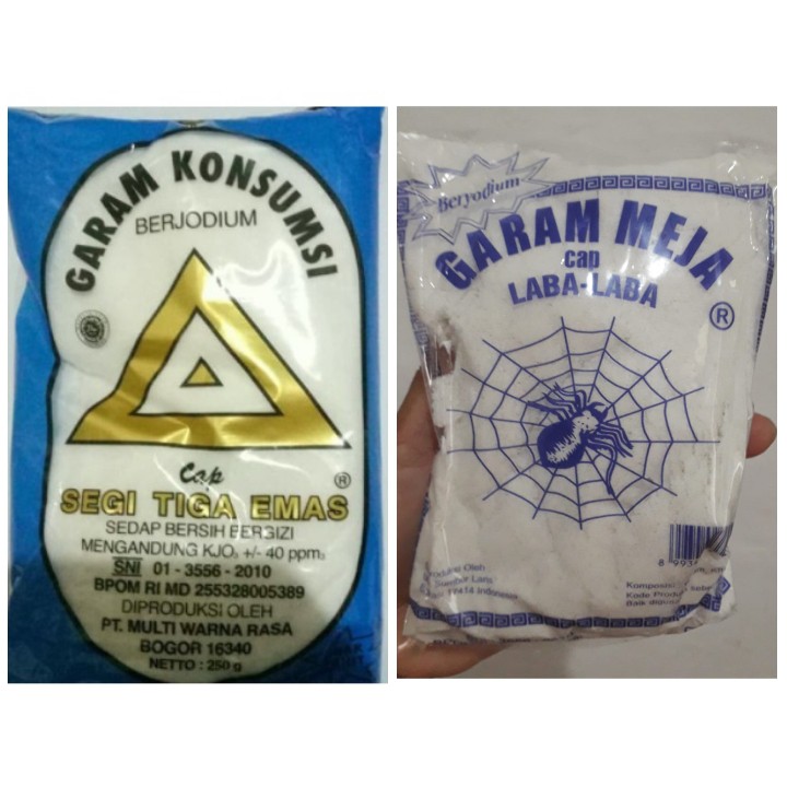 Pilihan garam : merk segitiga 250gr dan merk laba-laba 500gr