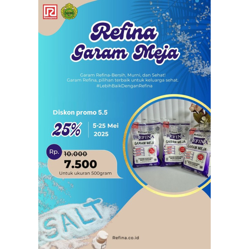Garam Refina - Garam Konsumsi Beryodium Halus, Lebih Asin & Tidak Mudah Menggumpal