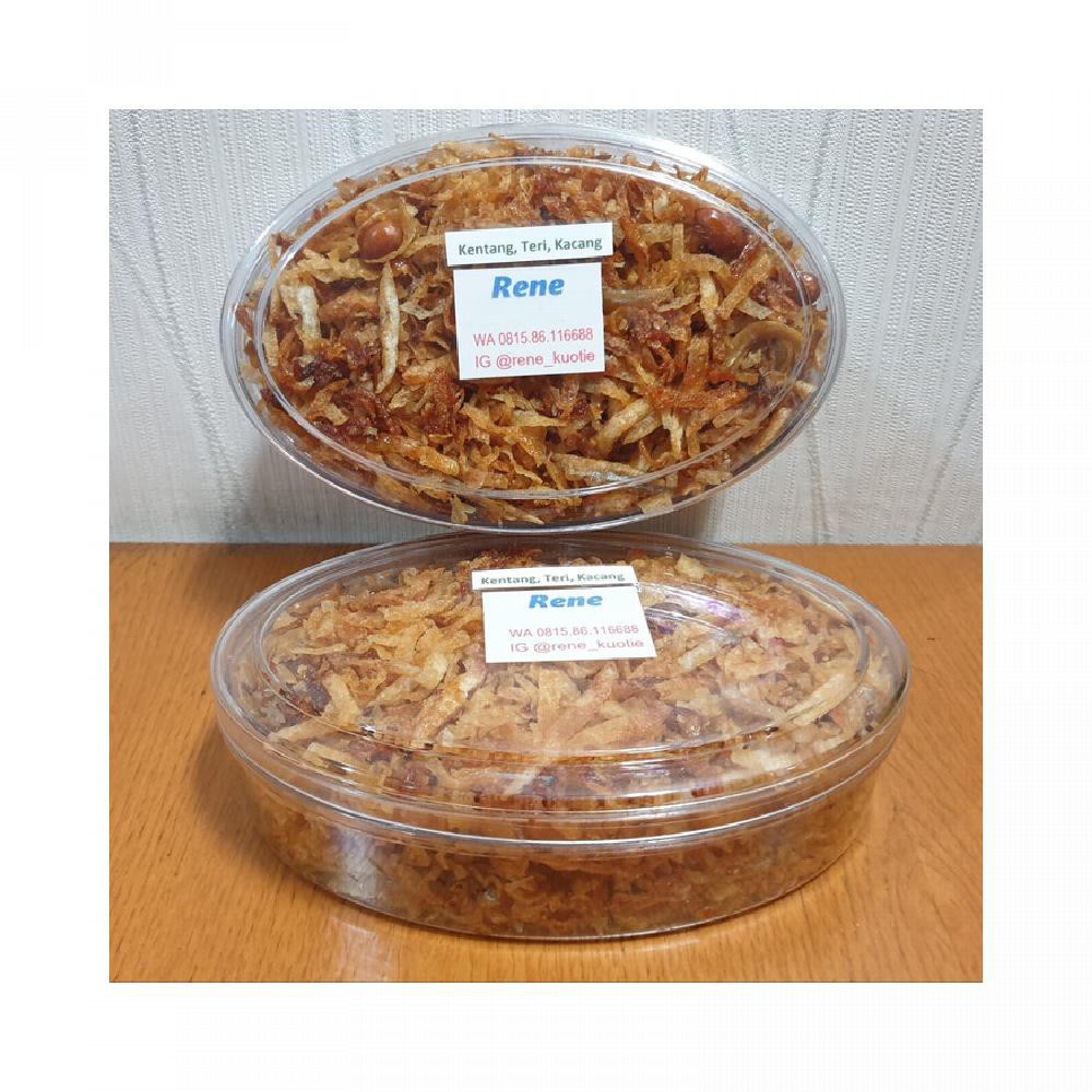 Irisan tipis kentang, digoreng dengan teri dan kacang. Renyah. Pas jadi temannya nasi.