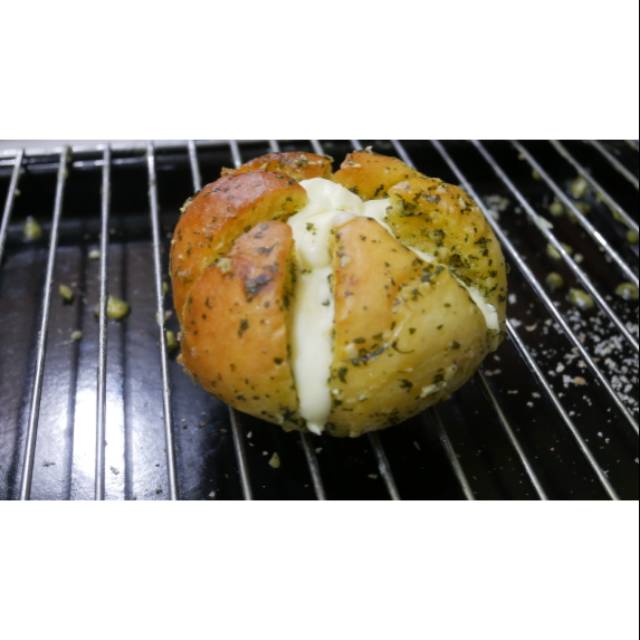 Roti yg dalamnya bertekstur lembut dengan filling cream cheese+whipped cream dan saus garlic parsley di bagian atasnya. Ukuran diameter 10cm.
