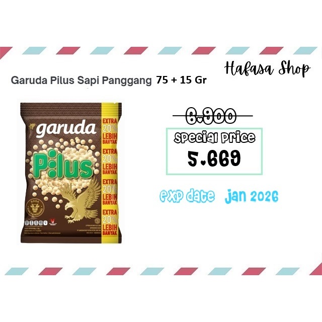 Garuda Snack Pilus rasa Sapi Panggang adalah snack berbentuk bulat-bulat kecil dengan rasa yang gurih sapi panggang. Kehadiran Garuda Snack Pilus Sapi Panggang menambah asik setiap aktifitas kamu. Makan nasi, bubur, dan menu favorit lainnya jadi lebih asik kalau ditambah Pilus Garuda.
