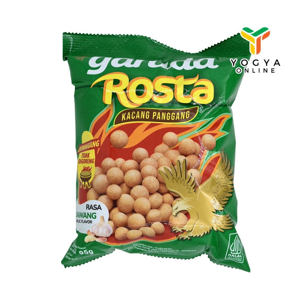 Garuda Rosta Kacang Oven Rasa Bawang merupakan kacang panggang yang dihasilkan dari kacang tanah pilihan yang garing dan padat, serta dibalut oleh tepung terigu dan dipanggang dengan minyak nabati yang sehat, tidak digoreng.