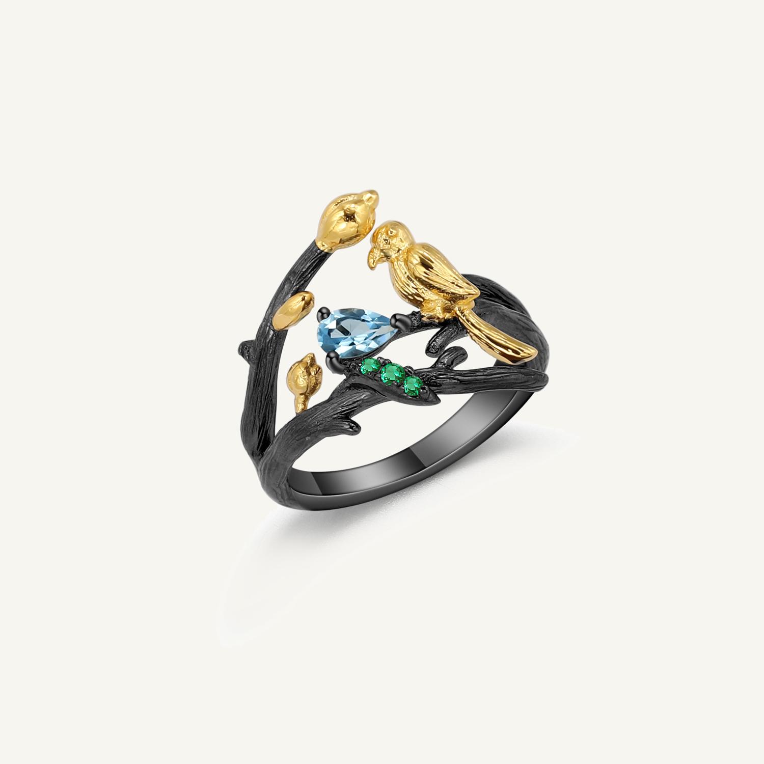 Gb Натуральный швейцарский синий топаз с цветочными бутонами, черные золотые кольца с птицами, стерлинговое серебро 925 пробы, регулируемое кольцо ручной работы для женщин