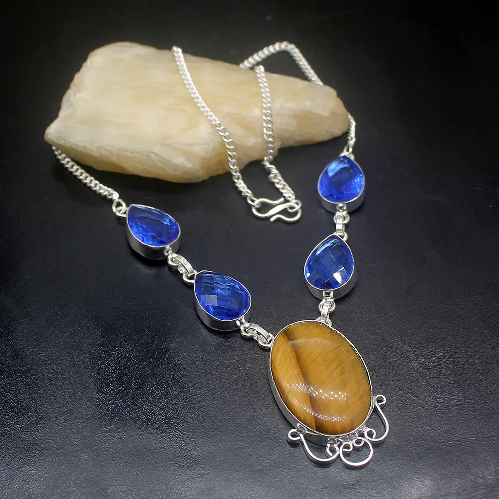 Gemstonefactory ювелирные изделия большая акция один уникальный 925 серебро синий топаз тигровый глаз женское ожерелье 46 см 20210062