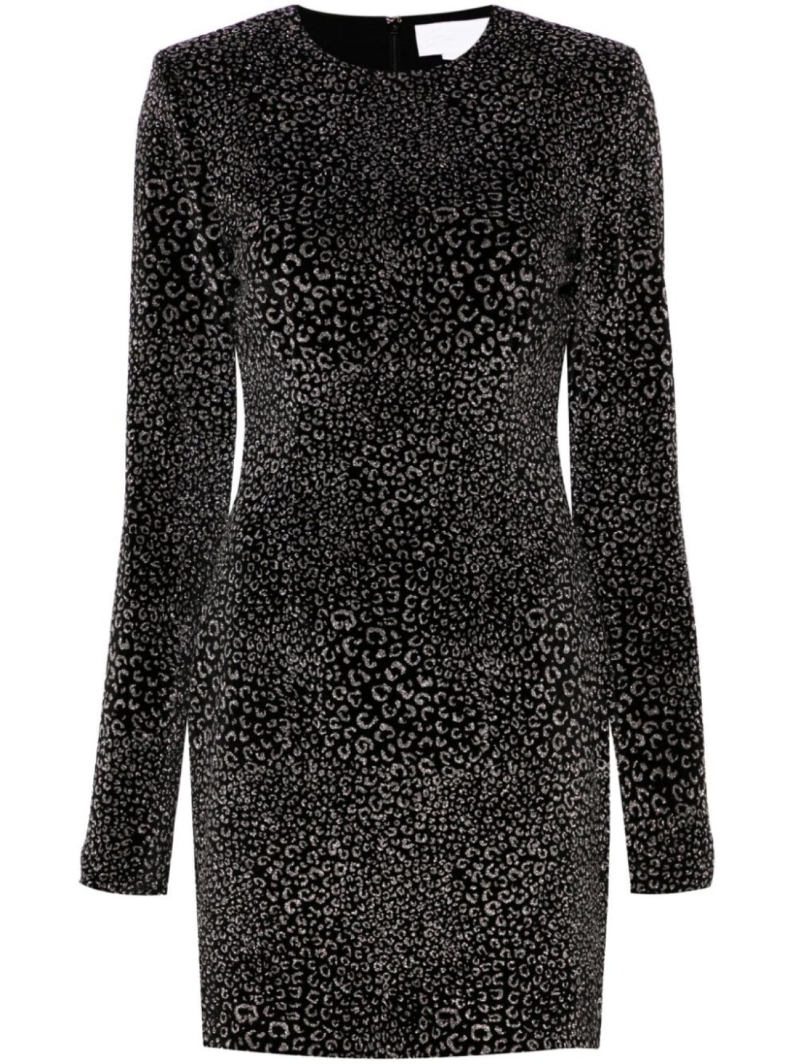 Подробнее о товаре: • черный • бархатный эффект • анималистичный узор с блестками • круглый вырез • застежка на молнии сзади • подплечники • длинные рукава • облегающий крой • прямой подол • длина до бедер • цельная подкладка
