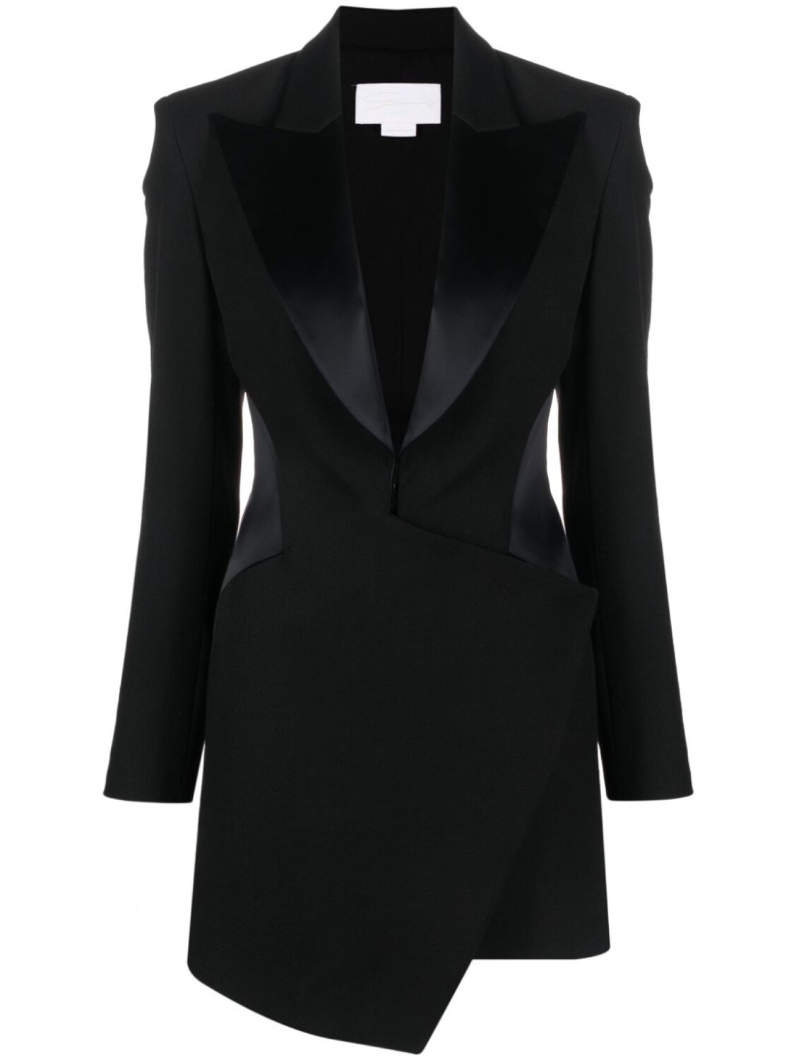 Черный, смесовая необработанная шерсть, атласная отделка, заостренные лацканы, потайная застежка спереди, длинные рукава, асимметричный подол и длина до бедер.