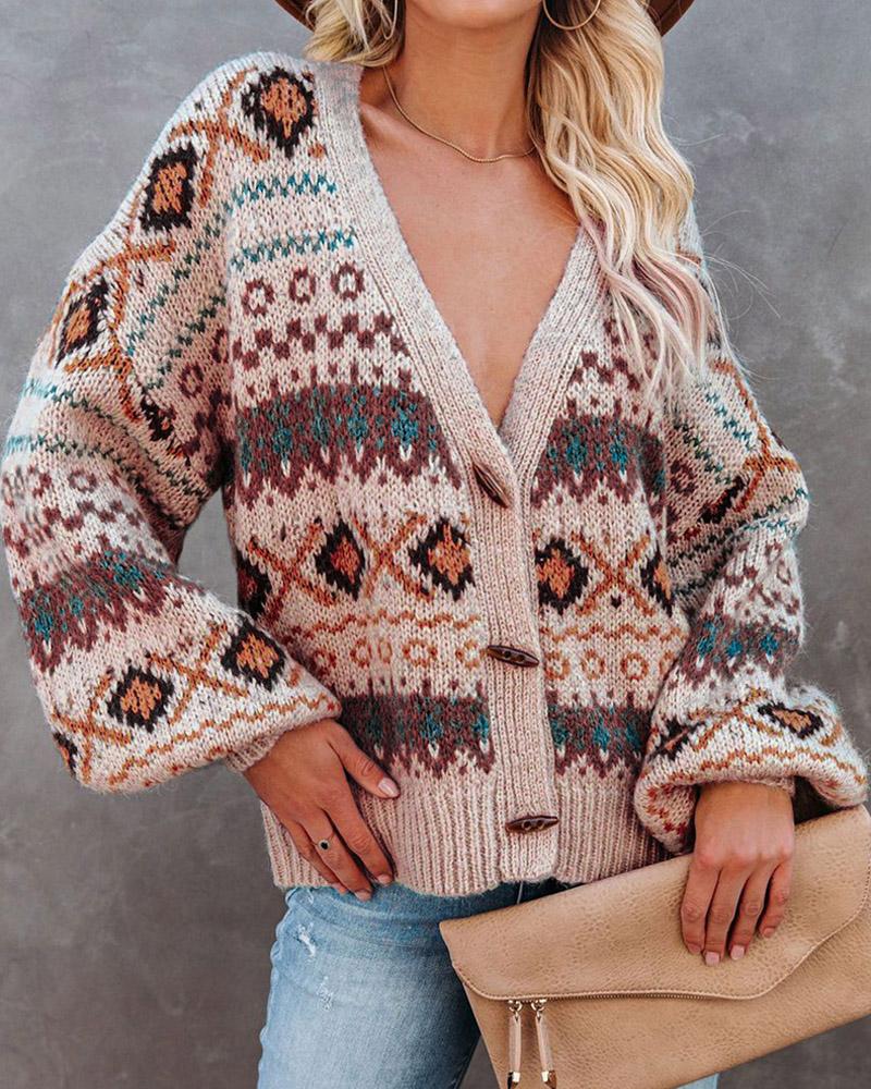 Geo Pattern Lantern Sleeve Button Front Cardigan, Pink