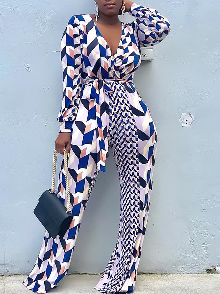 Geo Pattern Splicing Self Belted Wrap Jumpsuit