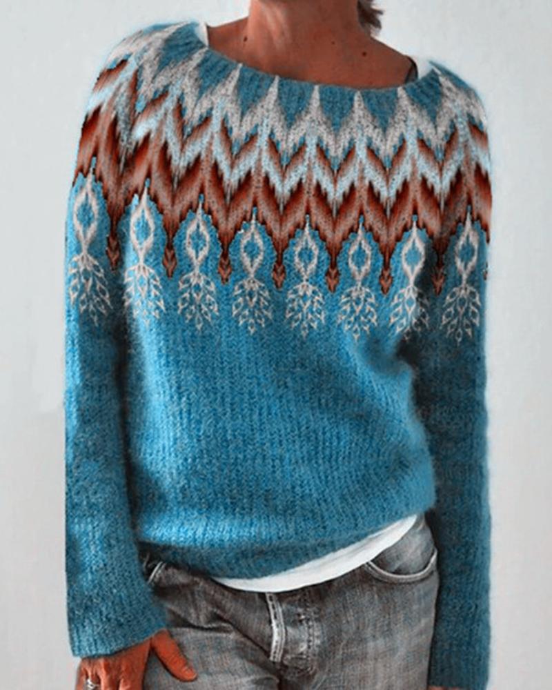 Geometric Pattern Boat Neck Knit Sweater, Blue