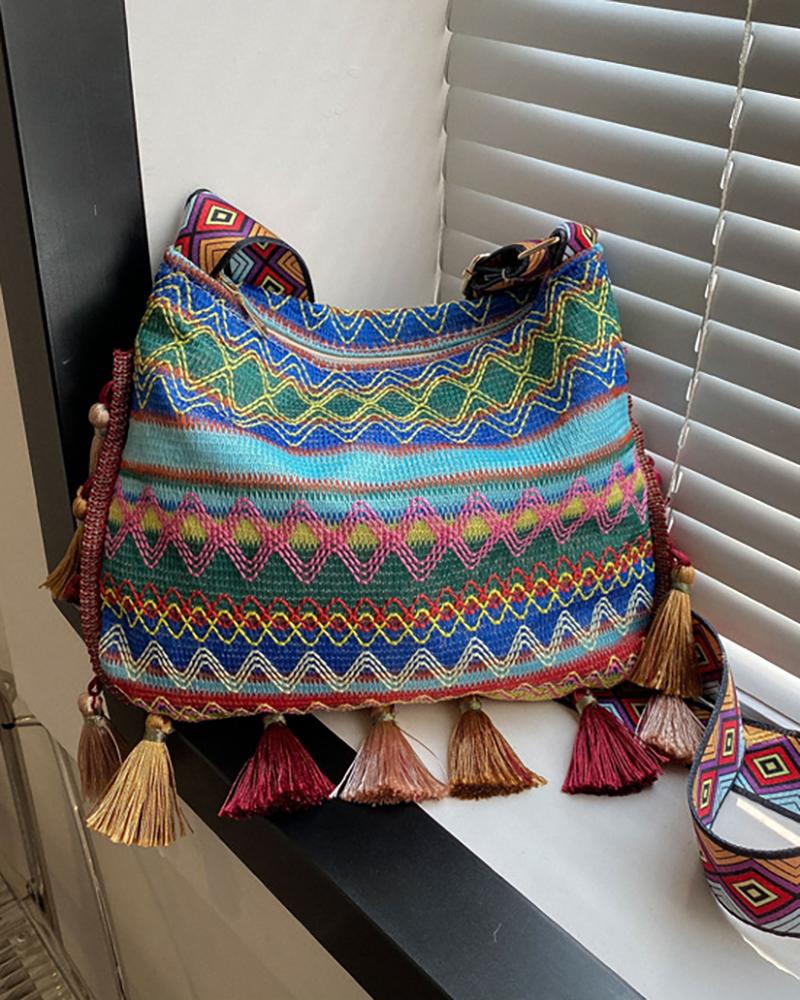 Geometric Pattern Fringe Design Magnetic Shoulder Bag, Blue