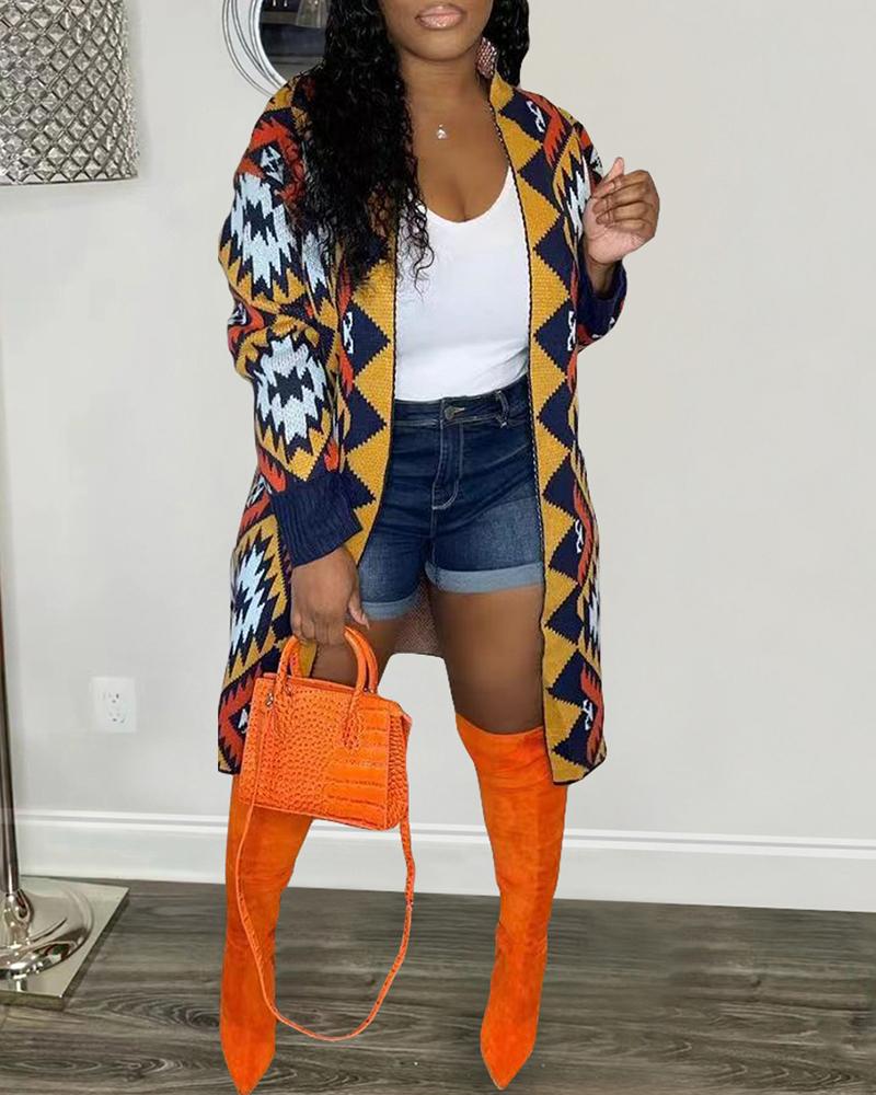 Geometric Pattern Long Sleeve Knit Cardigan, Orange