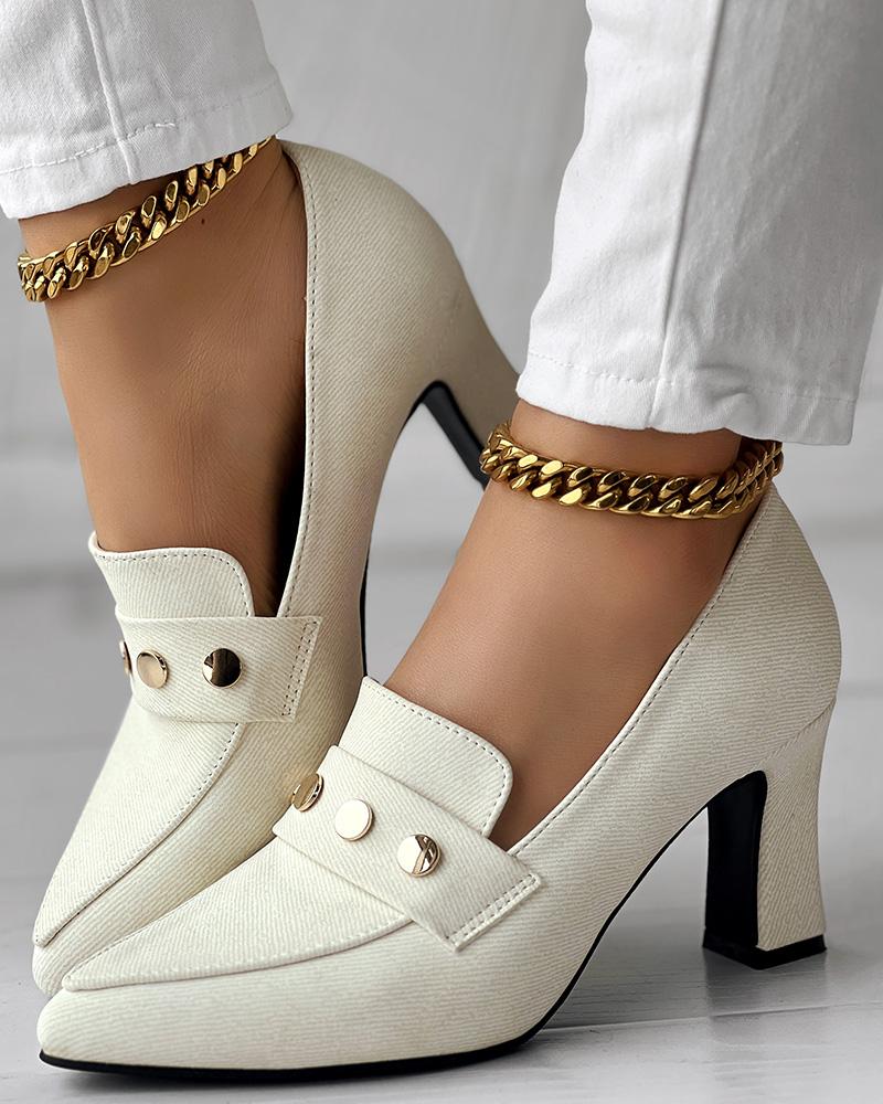 Geometric Pattern Point Toe Chunky Heel Pumps, Beige