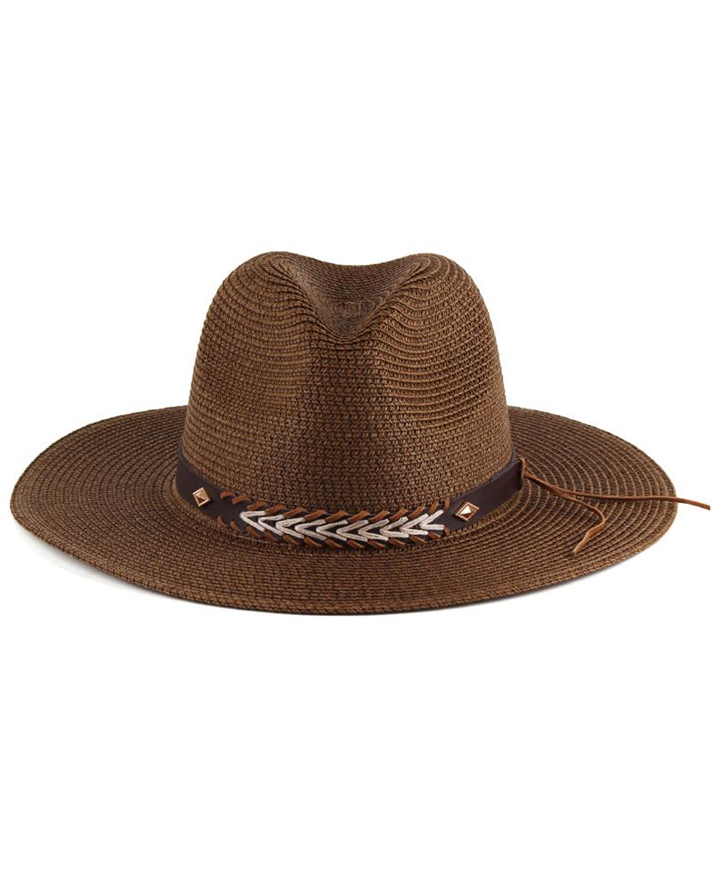 Geometric Pattern Wide Brim Straw Hat, Coffee