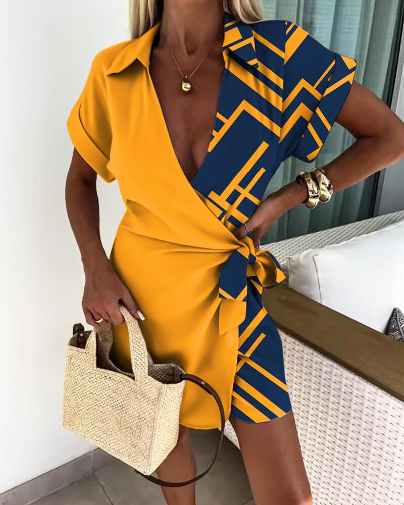 Geometric Print Tied Detail Overlap Romper, Yellow
