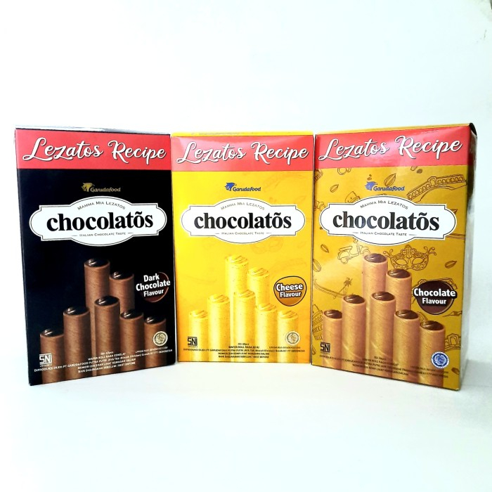Chocolatos Wafer Roll kemasan box isi 20 pcs. Ber-netto @16 gr (long), merupakan wafer roll isi dark coklat dan kulit wafer berwarna coklat tua dgn tetap mempertahankan kelezatan coklat ala Italia. Sangat populer dimasyarakat Indonesia dan telah ekspor ke mancanegara. Di produksi oleh PT. Garudafood Putra Putri Jaya - Gresik (Biscuit Div). Enak, Murah meriah, dan praktis.