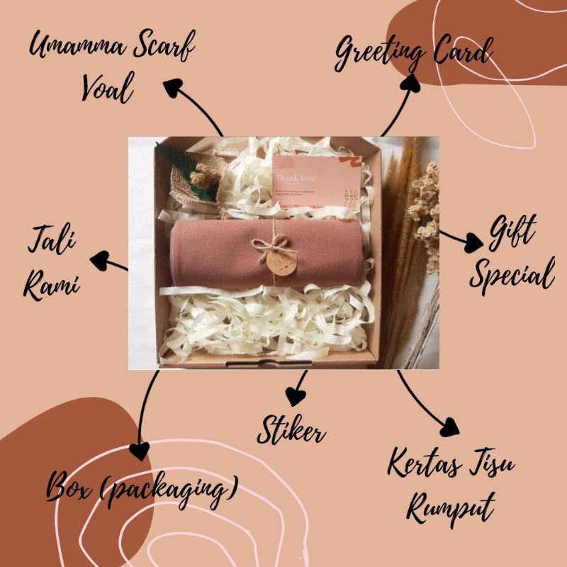 Gift Box| 1 pcs Umamma Scarf Voal + Greeting Card + Tali Rami + Stiker + Box(packaging) + Kertas Tisu Rumput + Gift Special