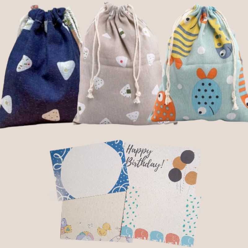 Berupa pouch ukuran 25 x 30 cm dengan kartu ucapan sesuai pilihan