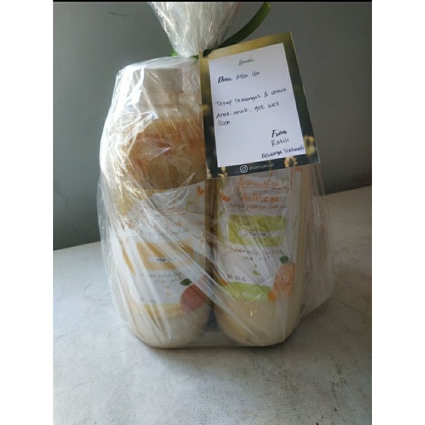 Tambahan plastic wrap, greeting card dan ribbon.
