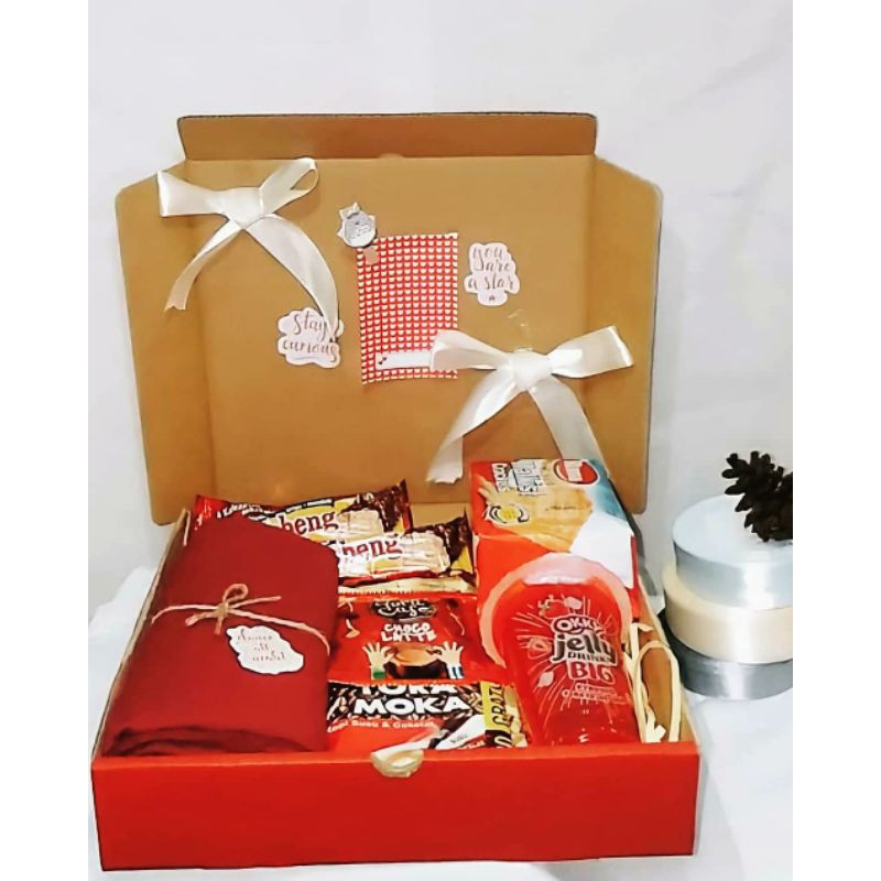 Kado sudah dibungkus cantik dengan box dan hiasan.