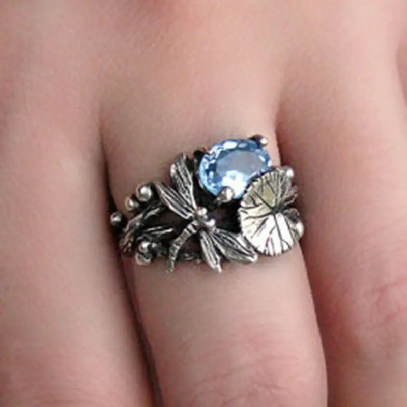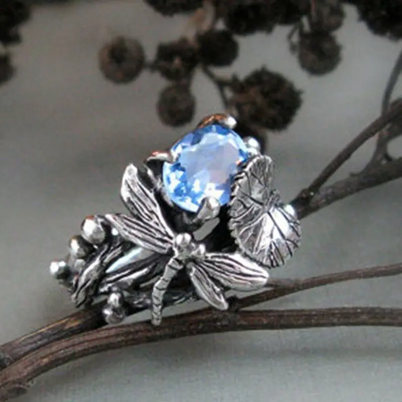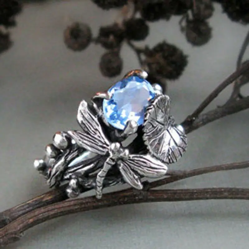 Girl Women Blue Flowers Size6-10 Jewelry Gift Rings Fashion Party 925 Silver Dragonfly Engagement Wedding Bands