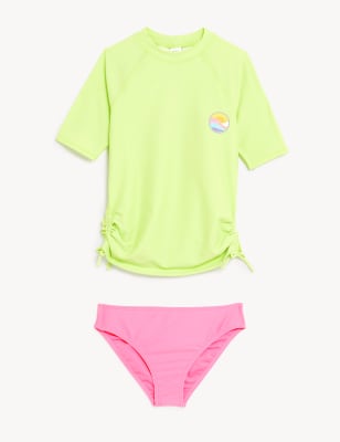 Fun and functional, this rash vest set is a holiday must-have. Set comprises a short-sleeved top and bikini bottoms. The rash vest keeps kids suitably covered and features a sunset motif on the front and 'Chasing Summer Everyday' slogan on the back. It's finished with adjustable ties at the side. Both pieces are made from UPF50+ Sun Smart fabric that helps protect skin against harmful UV rays. The material is also chlorine-resistant to last longer. Endorsed by the British Skin Foundation.