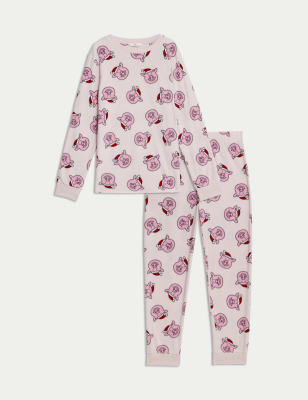Percy Pig™ has got his festive hat on for Christmas in these fun printed pyjamas. Regular fit. Includes a cosy long-sleeved top and a pair of full-length bottoms with an elasticated waist for comfort. Both are made from soft fleece fabric.